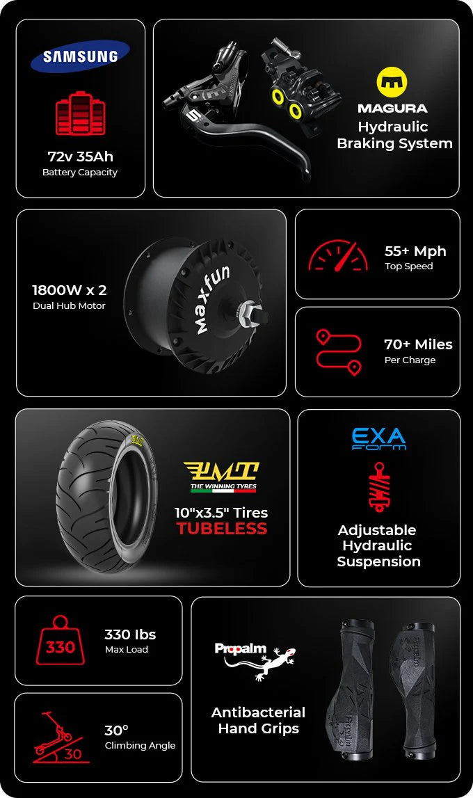 he Maxfun 10 MAX features a 72V, 35Ah removable Samsung battery, offering riders an impressive range of up to 70 miles. The 2520Wh large-capacity lithium battery delivers steady power output. It only takes 7 hours to fully charge with a 420W high-power adapter.